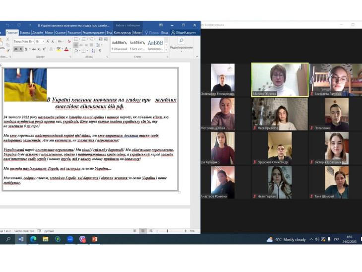 24 лютого, 2023 344 Загальнонаціональну хвилину мовчання проведено в дистанційній формі зі здобувачами освіти на кафедрі фізіології . 24 лютого 2023 року. Доцентами Жуковою М.Ю., Сухомлин Т.А. Читати Далі